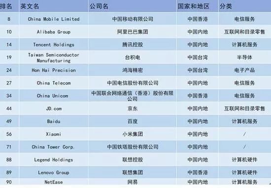 榜单显示,有14家中国企业上榜,其中中国移动有限公司排名最高,排名第8位,阿里巴巴集团和腾讯控股分列第10位和第14位。