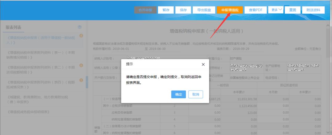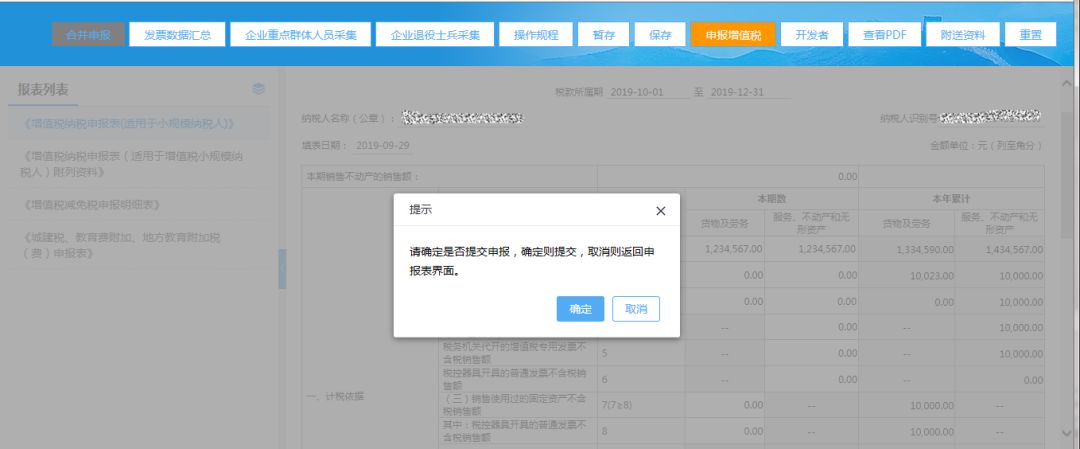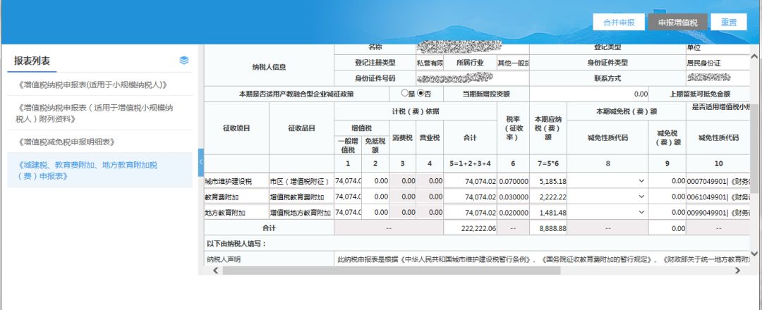 (6)检查附加税数据,填写完成相关数据项后,点击【合并申报】按钮,进行合并申报;