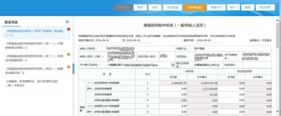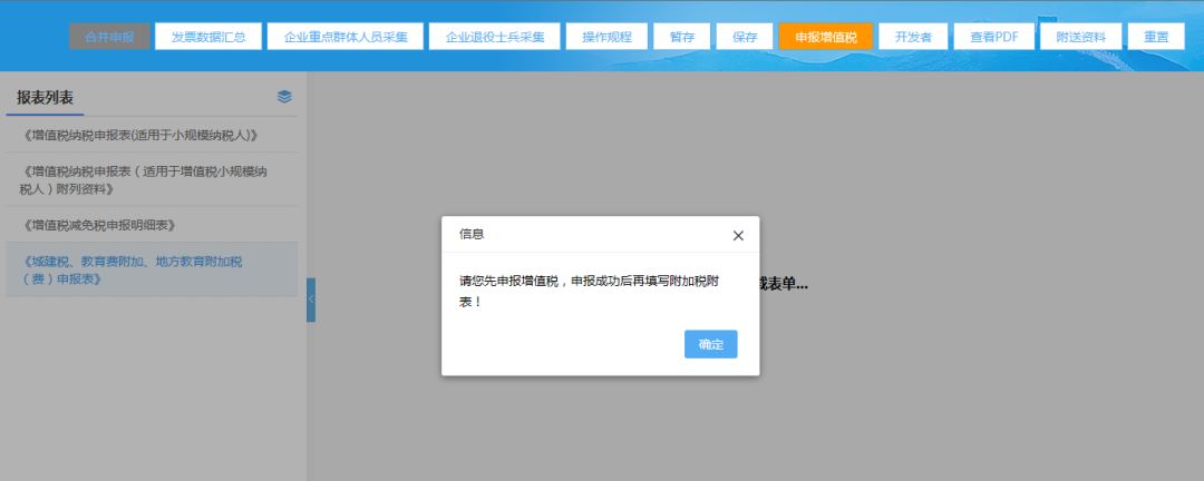 (2)进入增值税及附加税联合申报申报表填写页面,页面左边展示增值税申报表以及附加税申报表,纳税人首先需填写完成增值税申报表后,才能填写附加税申报表;