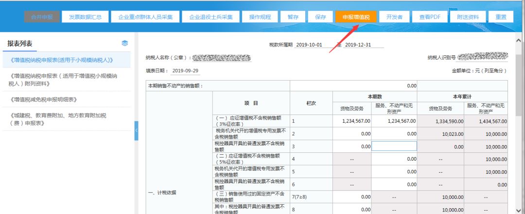 (3)填写完整增值税小规模申报表后,点击【申报增值税】按钮,系统仅提交增值税申报;