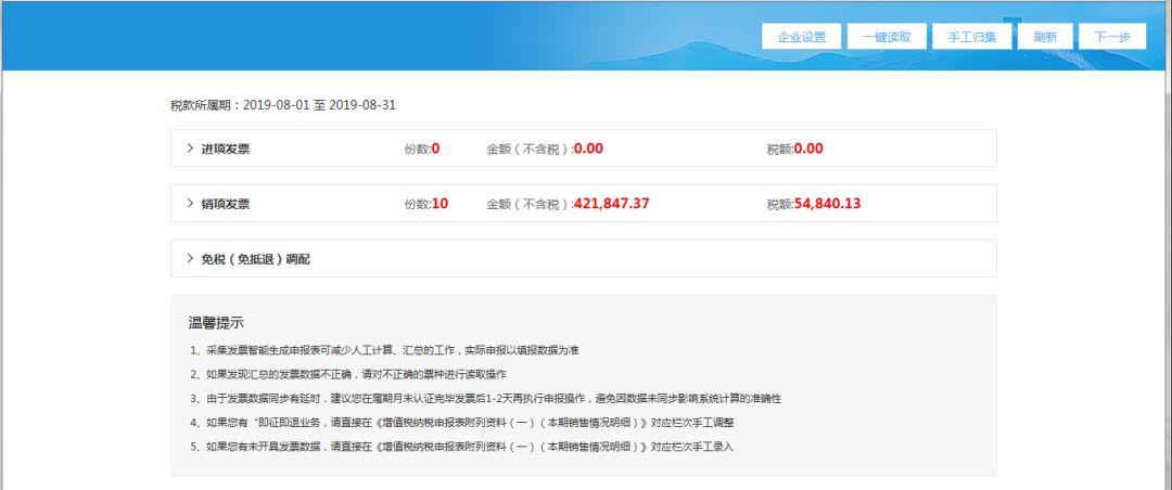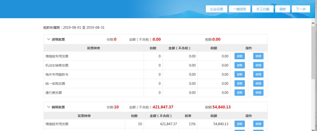 (2)进入发票汇总界面后,系统自动获取当期所有的进销项发票数据;
