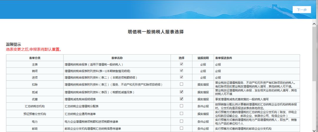 (3)发票汇总界面点击“下一步”按钮,系统进入增值税一般纳税人选表设置界面,企业根据自己实际业务发生情况勾选需报送的申报表,勾选完成点击“下一步”进入增值税纳税申报表,如下图:
