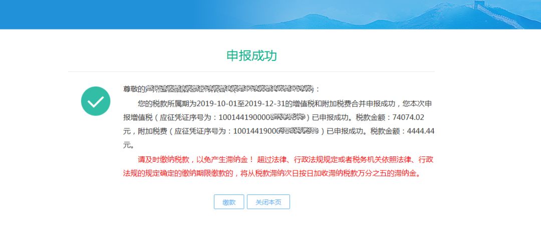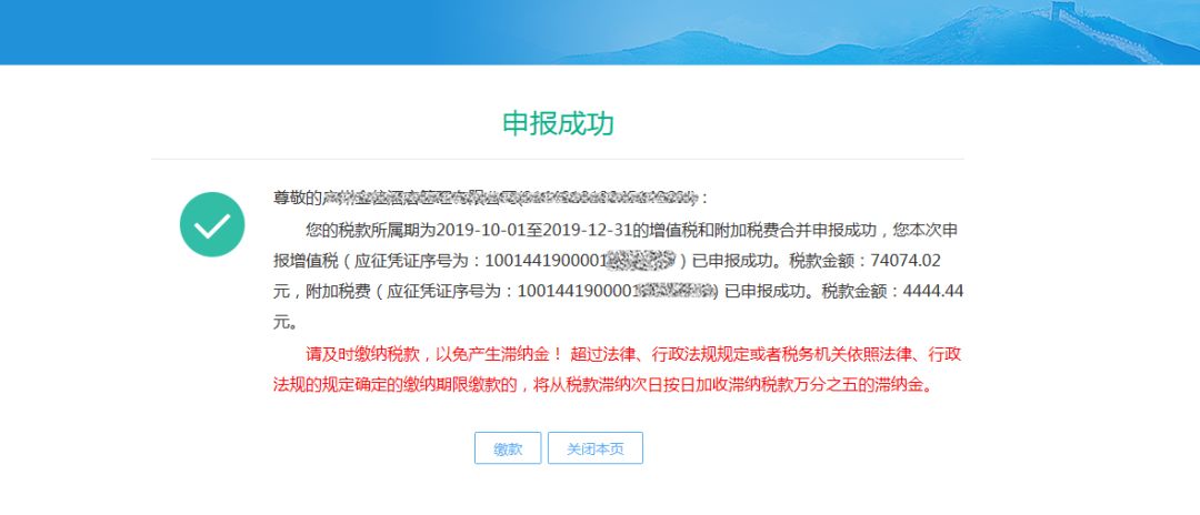 (4)增值税申报成功后,系统返回增值税申报成功,点击【确定】按钮可进行附加税申报;