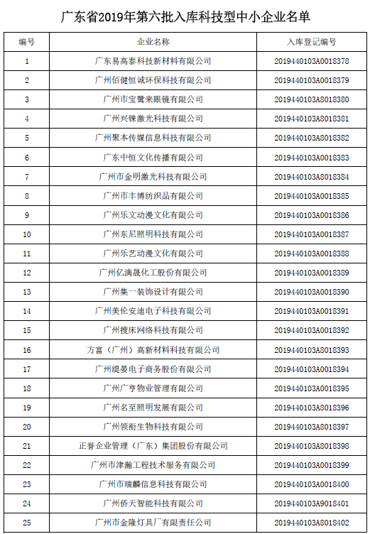 根据《科技型中小企业评价办法》(国科发政〔2017〕115号)和《科技型中小企业评价办法工作指引(试行)》(国科火字〔2017〕144号)有关要求,经公示通过,现将广东省2019年第六批入库的1157家科技型中小企业名单(详见附件)予以公告。