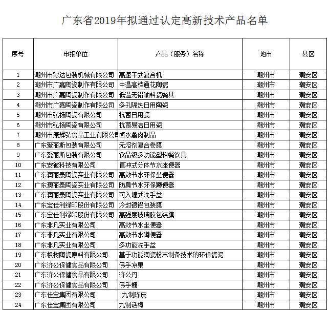 根据《关于组织申报广东省2019年高新技术产品认定的通知》(粤高企协〔2019〕8号)的要求,经企业申报、专家评审等规定程序,2019年广东省高新技术产品认定评审工作已完成。高速干式复合机 等33030项产品拟认定为广东省高新技术产品(名单见附件),现予以公示,公示期为5个工作日(11月21日截止)。