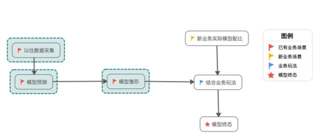 已有业务场景:采集以往数据并做处理,作为预测数据,形成一个模型雏形,结合新的业务玩法,形成已有业务的模型;新业务场景:直接按照新的业务,模型配比,形成一个新业务模型。