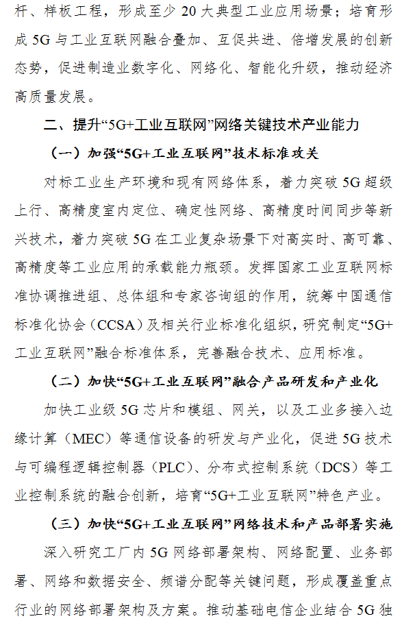 1.到2022年,突破一批面向工业互联网特定需求的5G关键技术,“5G+工业互联网”的产业支撑能力显著提升;