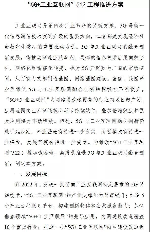 以下为《“5G+工业互联网”512工程推进方案》全文: