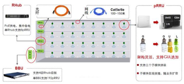 与无源室分系统相比,有源室分系统主要上由BBU、RHUB、pRRU三部分组成,BBU基带处理单元首先连接到RHUB上,RHUB就类似于一个集线器(或交换器),可以连接多个pRRU,这里的pRRU可以看做传统基站上的RRU的“小型化”,而收发天线就集成在pRRU内部。实际上,这样的组网方式也叫做“分布式皮基站”。与此相对应的是“一体化皮基站”,也就是把BBU、pRRU集合成一体。一般来说,“一体化皮基站”覆盖较小的简单区域,“分布式皮基站”对于复杂的区域,扩展方便。
