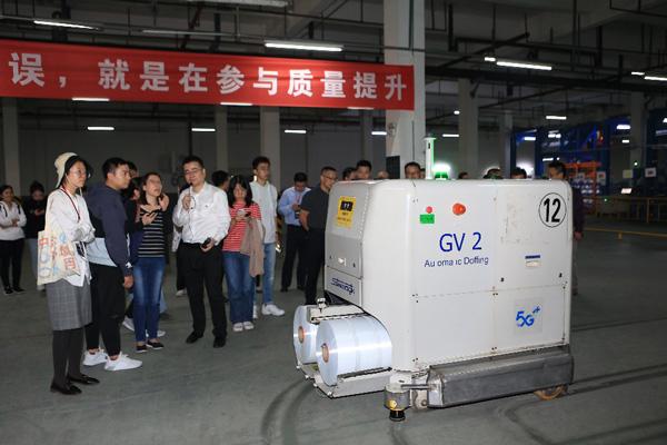 笔者参观浙江新凤鸣集团,厂内的IGV小车正在沿着规定的路线搬运丝饼,丝饼位于下方白色长筒状,小车受5G网络控制,在厂区车间移动