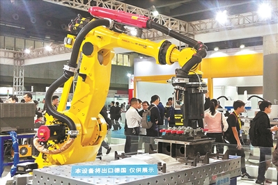 展会现场,一个“本设备将出口德国,仅供展示”的告示牌已经吸引了很多参展商拍照与咨询,记者看见这是一个焊接机器人。广东省机器人创新中心总经理刘尔彬告诉广州日报记者,设备原本已经在出发去德国的路上,为了这次展览,特别推迟了行程。