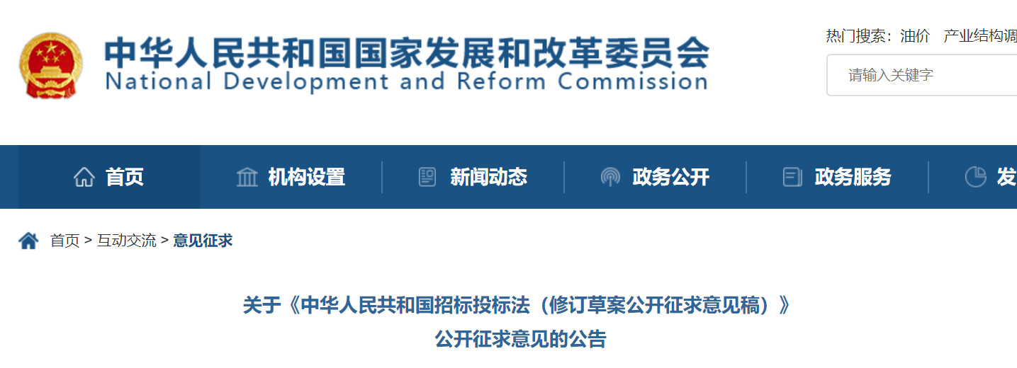 2019年12月3日国家发展改革委官网公布《中华人民共和国招标投标法(修订草案公开征求意见稿)》。
