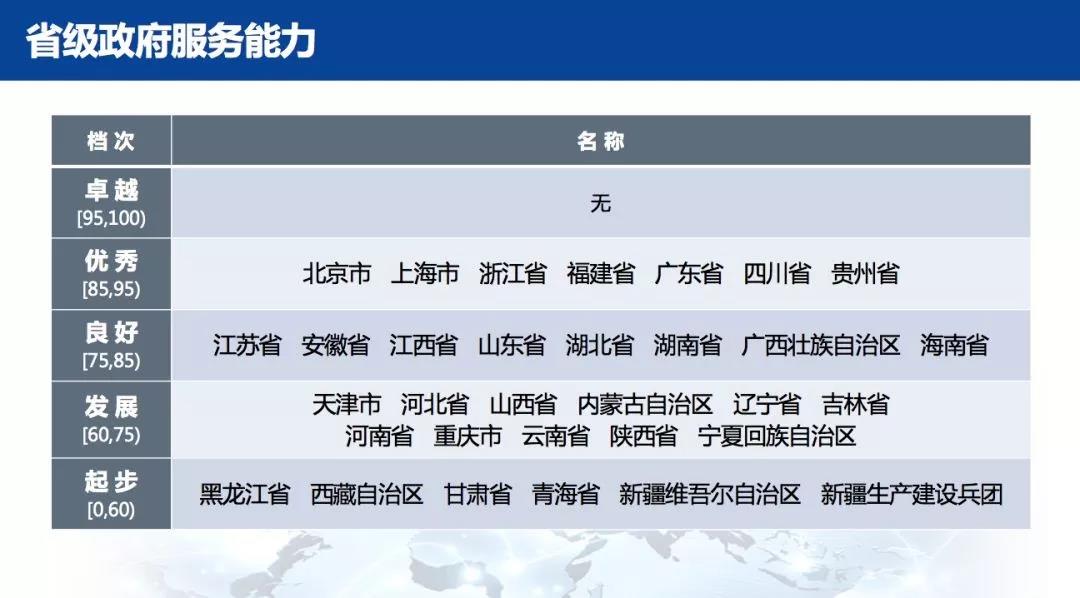 在省级政府服务能力方面,北京市、上海市、浙江省、福建省、广东省、四川省、贵州省9省市位居全国第一梯队,能力“优秀”。