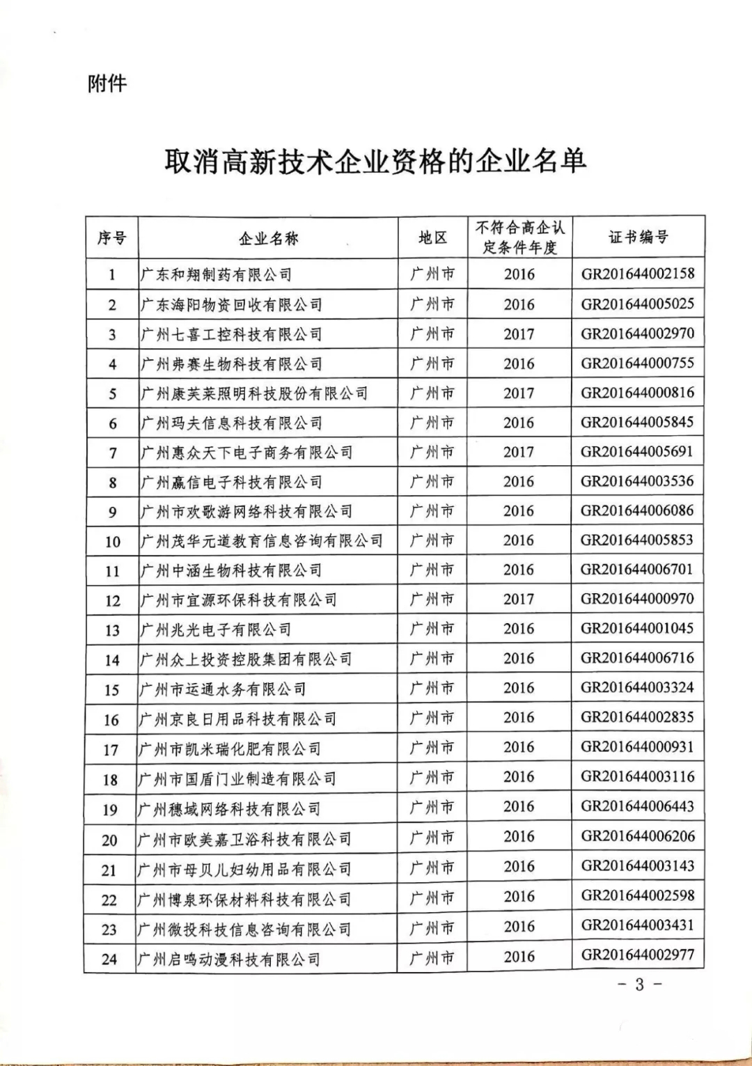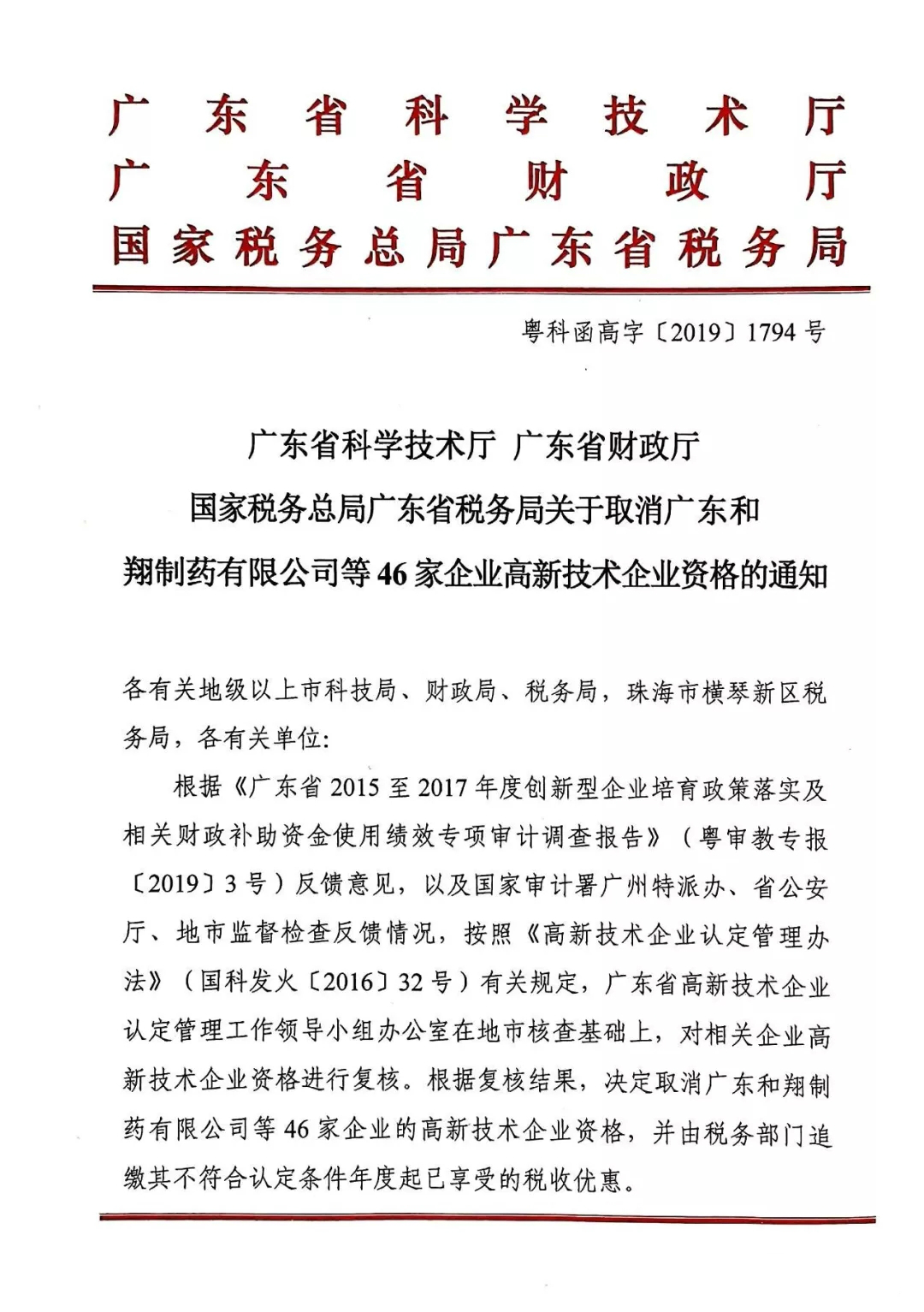关于取消广东和翔制药有限公司等46家企业高新技术企业资格的通知.pdf