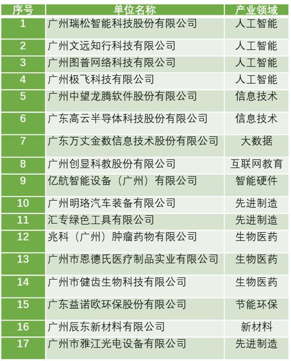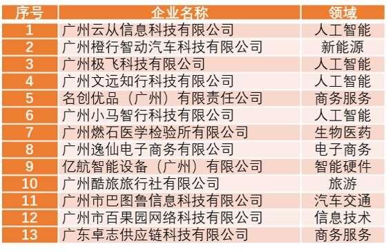 其中,广州云从信息科技有限公司等13家企业入选2019年广州“独角兽”创新企业榜单,广州慧智微电子有限公司等45家企业入选2019年广州“未来独角兽”创新企业榜单,广州瑞松智能科技股份有限公司等17家企业入选2019年广州“高精尖”企业榜单。