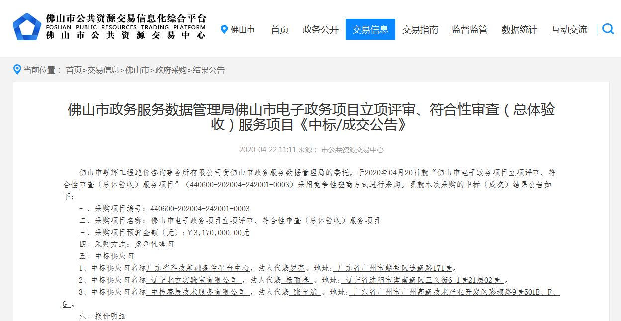 中检赛辰技术服务有限公司(以下简称:赛辰)2020年4月22日以竞争性磋商方式优胜其他同行竞争者,成功中标【佛山市某某局佛山市XX项目立项评审、符合性审查(总体验收)服务项目】。