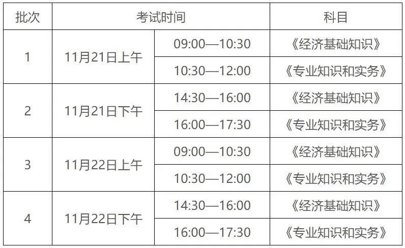 初级、中级考试均设公共科目《经济基础知识》和专业科目《专业知识和实务》,题型均为客观题,分2天上、下午4个批次实施。各批次考试安排如下: