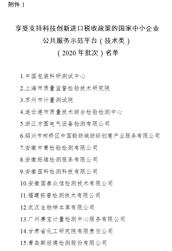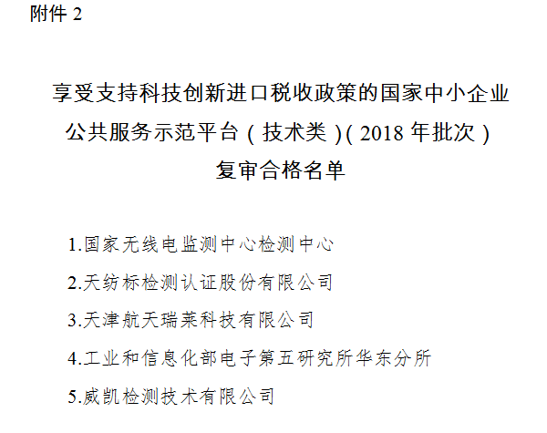 二、国家无线电监测中心检测中心等5家示范平台(见附件2)复审合格,继续享受支持科技创新进口税收政策。
