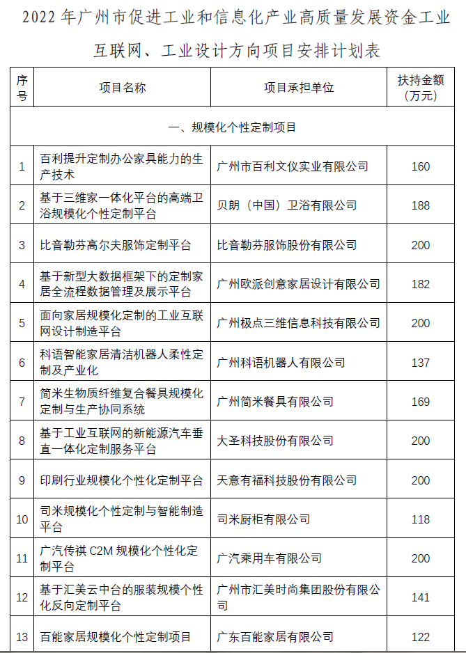 根据《广州市工业和信息化局关于发布2022年广州市促进工业和信息化高质量发展资金项目申报指南的通知》要求,经各区推荐、专家评审等工作程序,现将拟支持的2022年广州市促进工业和信息化产业高质量发展资金工业互联网(不含特色产业集群数字化平台应用推广奖励)、工业设计方向项目名单和扶持金额予以公示,公示期5个工作日。