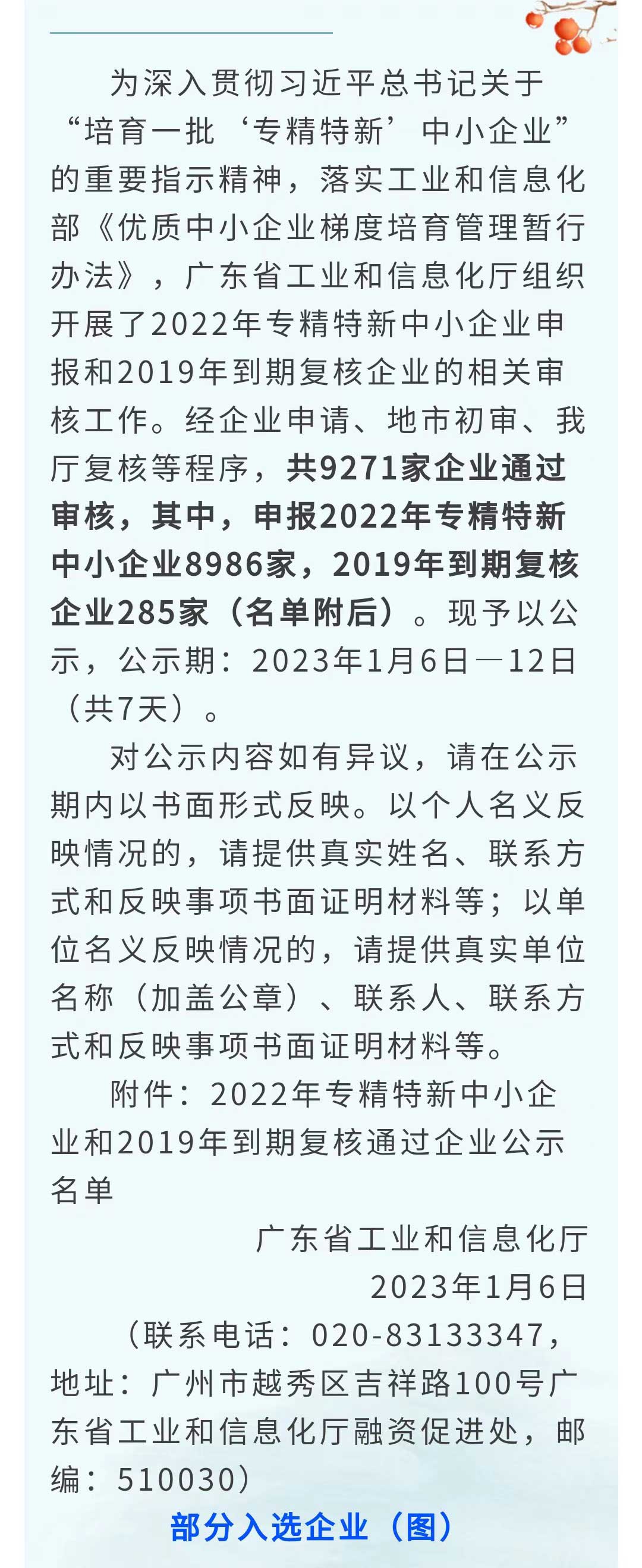 广东省工业和信息化厅关于2022年专精特新中小企业和2019年到期复核通过企业名单的公示