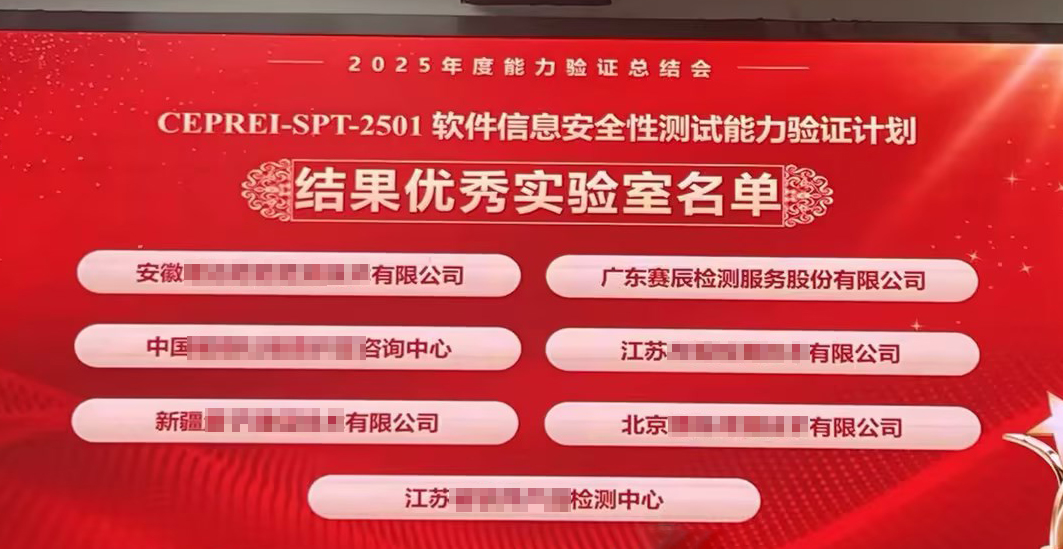 广东赛辰检测服务股份有限公司(简称"赛辰")凭借扎实的技术实力、规范的测试流程和稳定的质量管理水平,在CEPREI-SPT-2501软件信息安全性测试能力验证中严格按照能力验证要求制定测试方案,编写测试用例并反复验证,对测试结果进行科学分析,获得评审专家的高度认可,以优异成绩脱颖而出,荣评"2025年度软件信息安全性测试能力优秀实验室"称号。