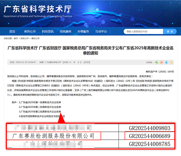 近日广东省科学技术厅 广东省财政厅 国家税务总局广东省税务局关于公布广东省2025年高新技术企业名单的通知,赛辰检测凭借卓越的技术创新能力和扎实的研发实力,再次荣获"高新技术企业"称号。