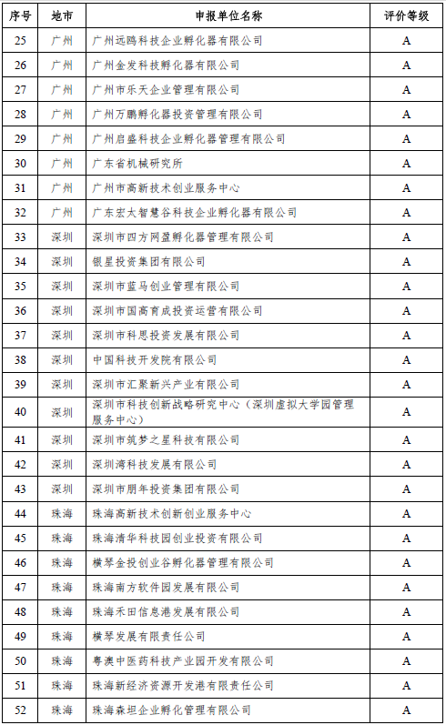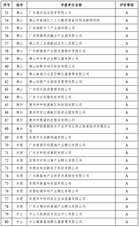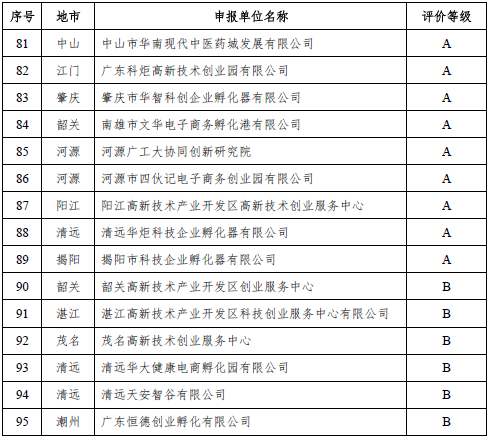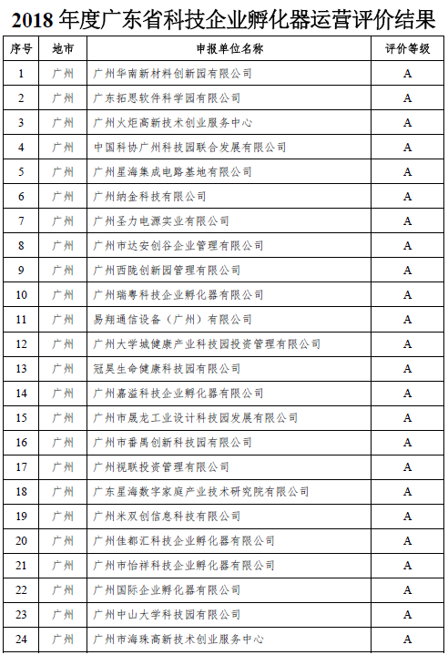 为贯彻落实《广东省科学技术厅 广东省财政厅关于科技企业孵化器、众创空间后补助试行办法(修订)》(粤科规范字〔2018〕1号)文件,省科技厅组织专家对自愿参加2018年度科技企业孵化器、众创空间运营评价的单位进行评价。通过形式审查、定量指标初审、专家评审等程序,确定评为优秀(A级)的孵化器89家,评为良好(B级)的孵化器53家,评为合格(C级)的孵化器69家;评为优秀(A级)的众创空间80家,评为良好(B级)的众创空间92家,评为合格(C级)的众创空间48家。