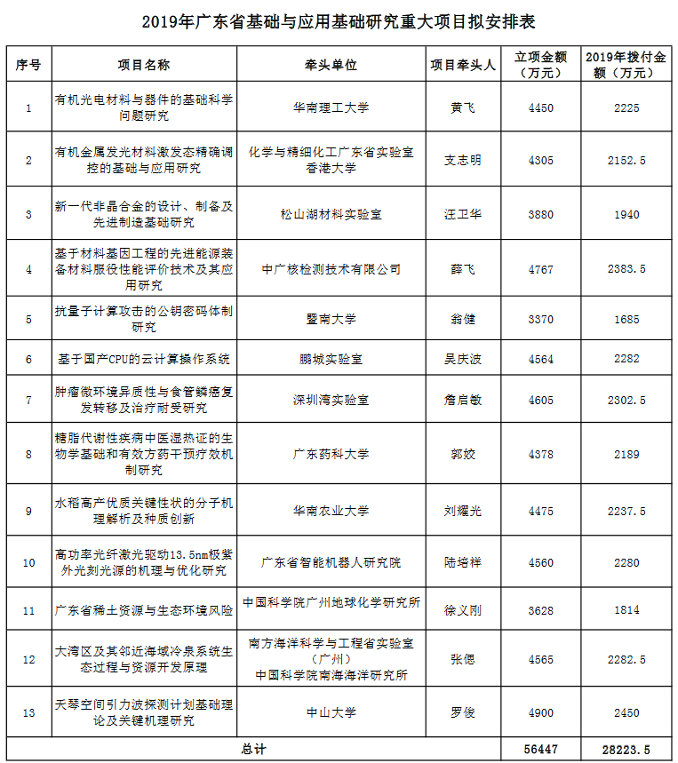 根据《广东省省级财政专项资金管理办法有关》规定,拟安排2019年度基础与应用基础研究重大项目,本批项目共计13项,拟安排财政专项资金28223.5万元,现予以公示。公示期自2019年10月14日~10月20日,共7天。