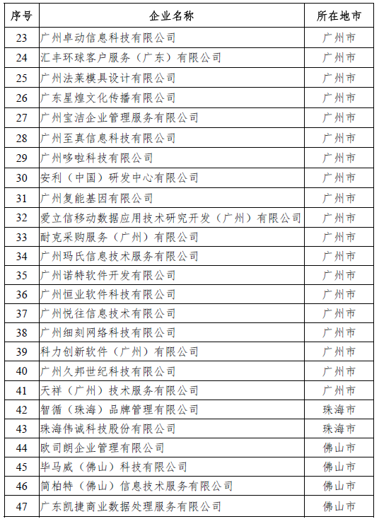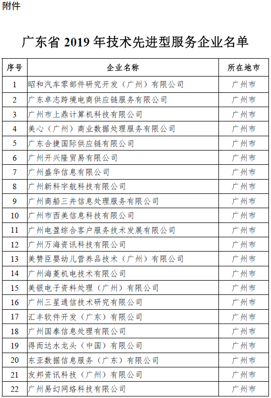 根据《广东省科学技术厅 广东省商务厅 广东省财政厅 国家税务总局广东省税务局 广东省发展和改革委员会关于印发〈广东省技术先进型服务企业认定管理办法(试行)〉的通知》(粤科规范字〔2018〕3号)的有关规定,经企业申报、地市推荐、专家评审、网上公示等环节,昭和汽车零部件研究开发(广州)有限公司等47家企业被认定为2019年技术先进型服务企业(详见附件)。