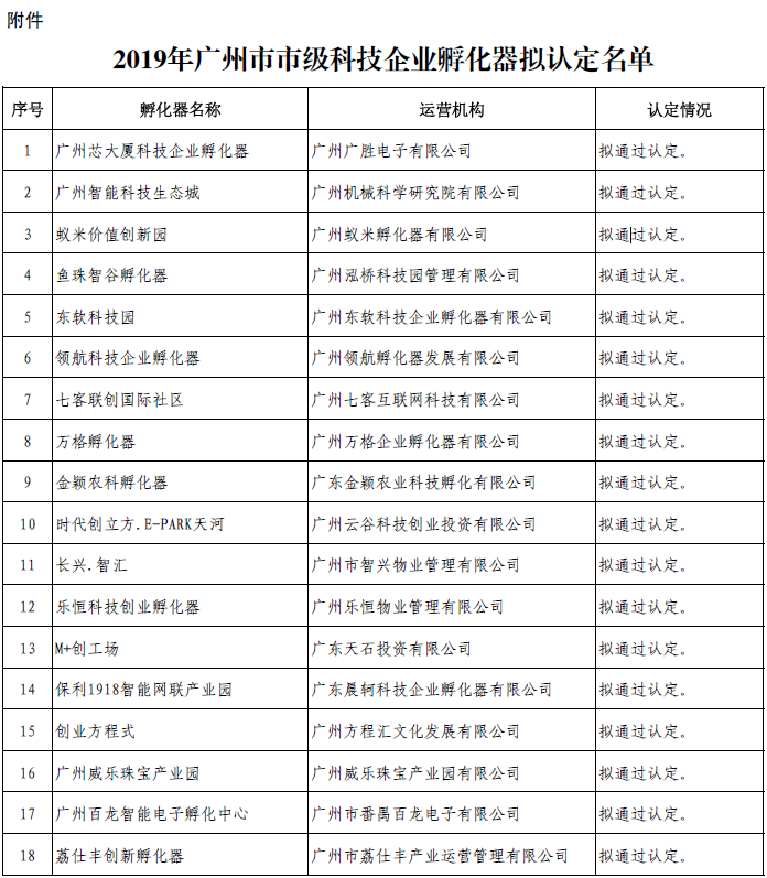 根据《广州市科技计划项目管理办法》(穗科创规字〔2019〕3号)有关规定,现对2019年广州市市级科技企业孵化器拟认定名单予以公示。公示时间为2019年12月26日至2020年1月2日。