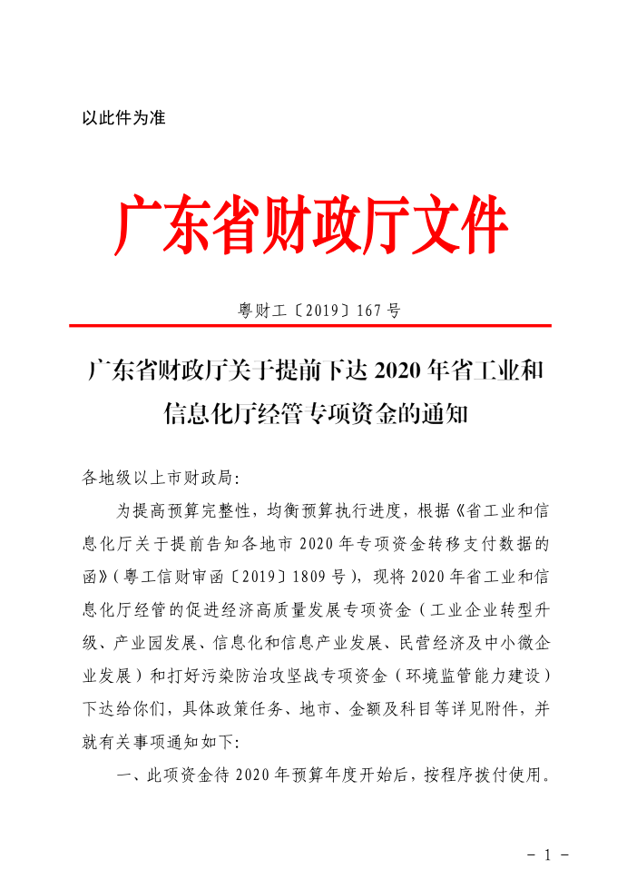 2.广东省财政厅关于提前下达2020年省工业和信息化厅经管专项资金的通知