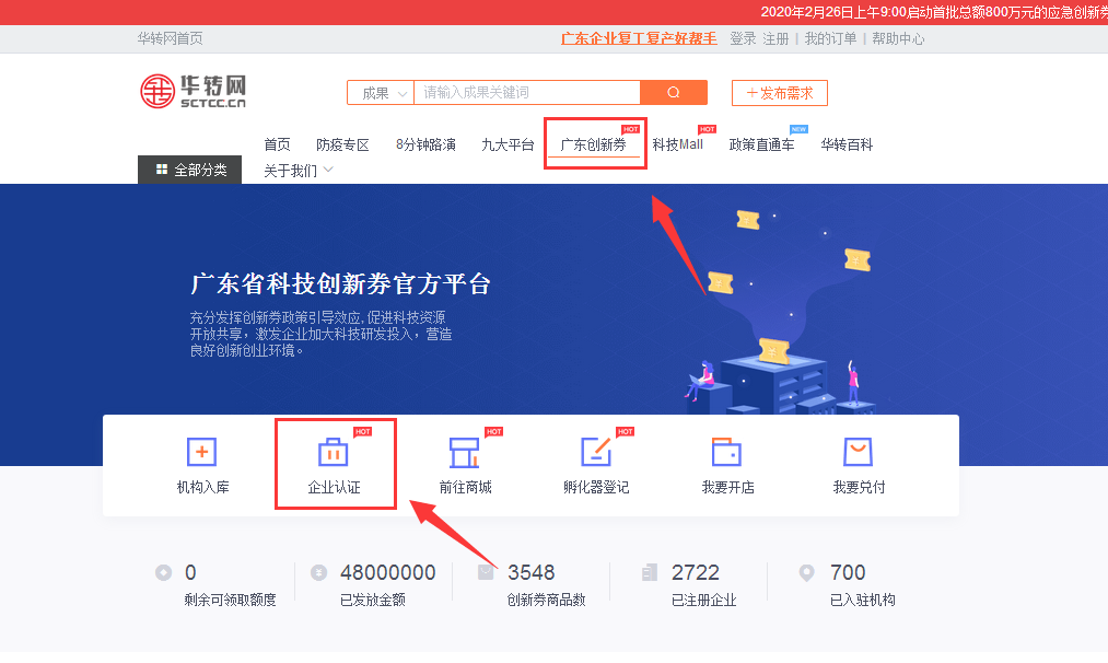 打开广东省创新券工作实施的官方平台——华转网(http://www.sctcc.cn),并完成注册步骤。