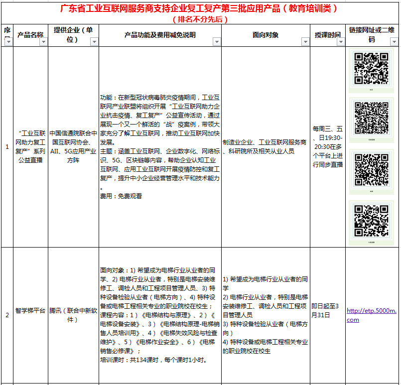 附件:广东省工业互联网服务商支持企业复工复产第三批应用产品(教育培训类).xls