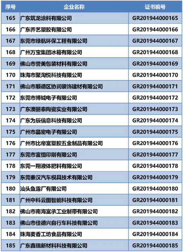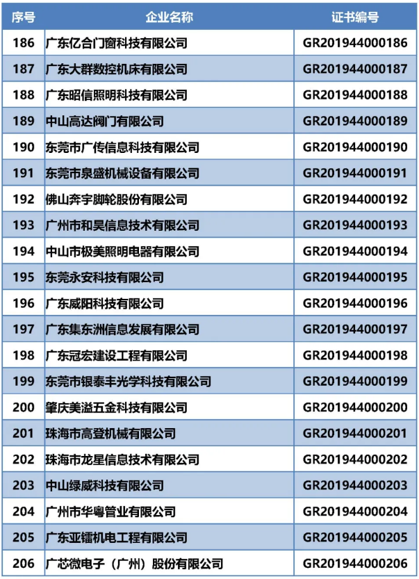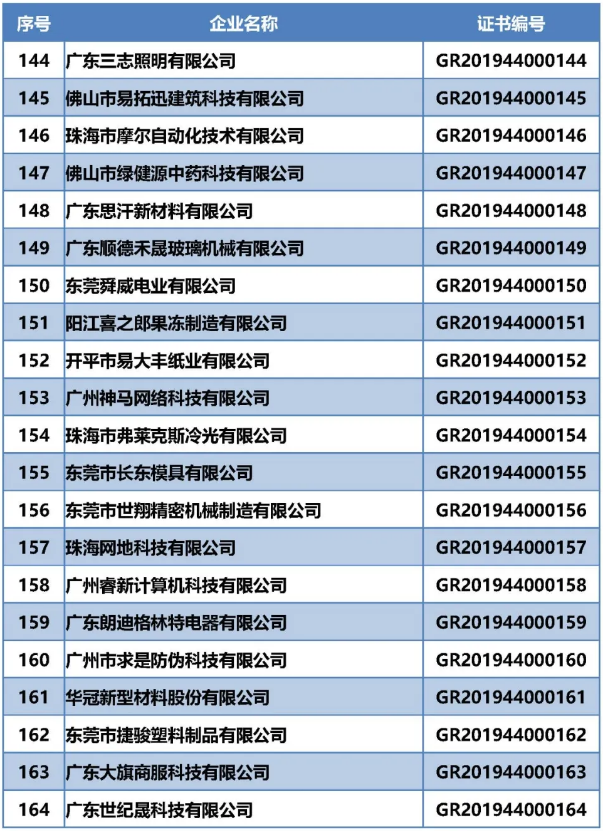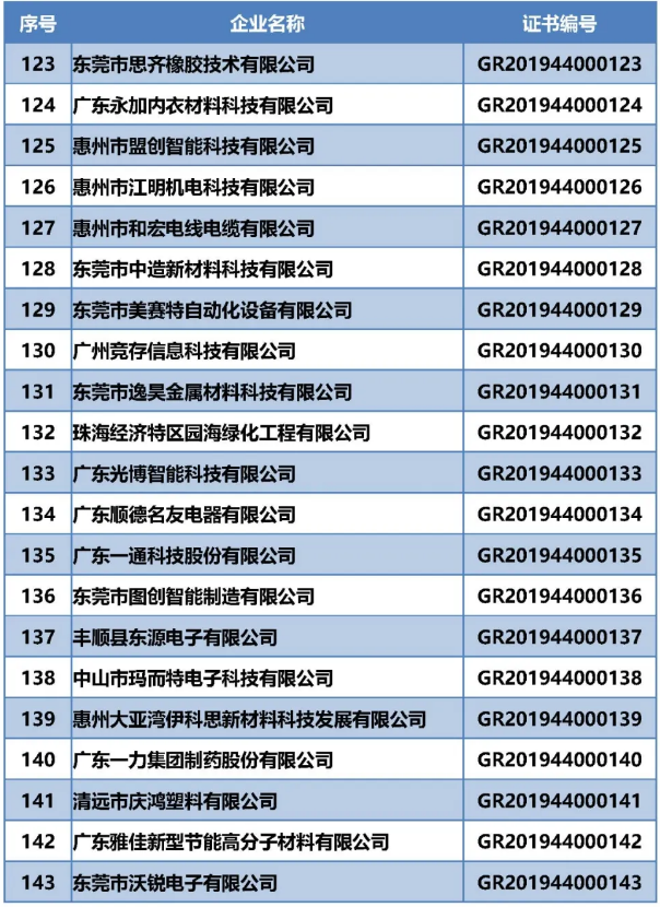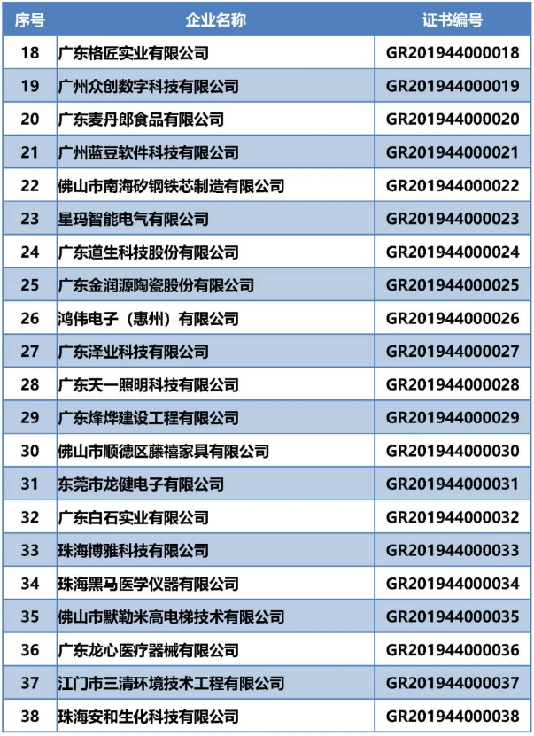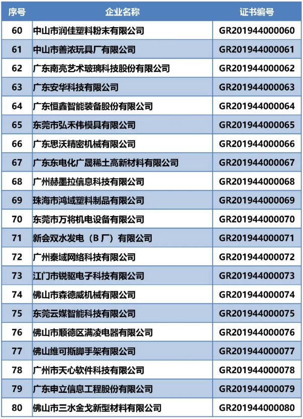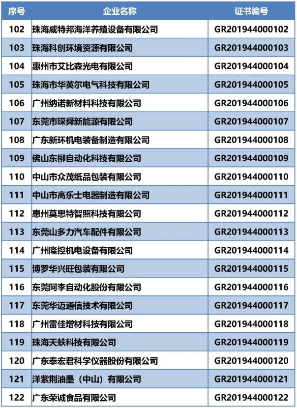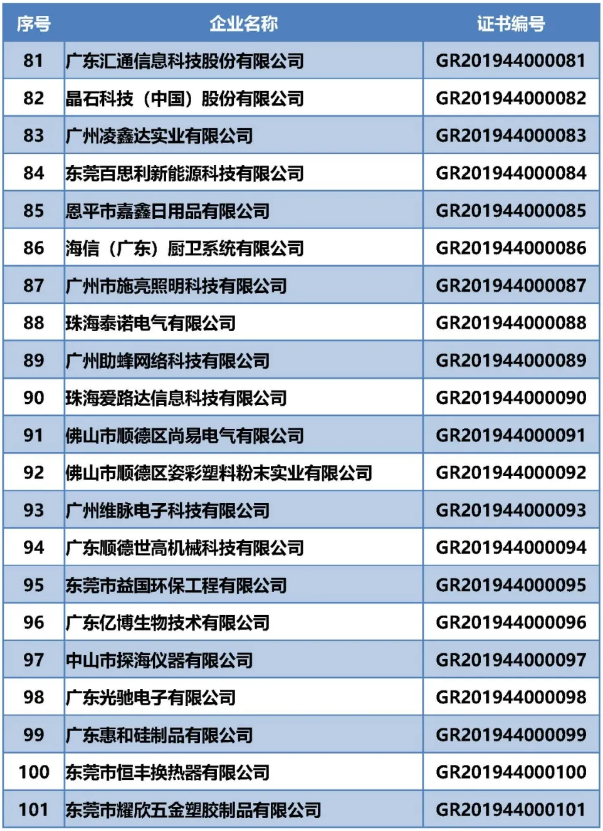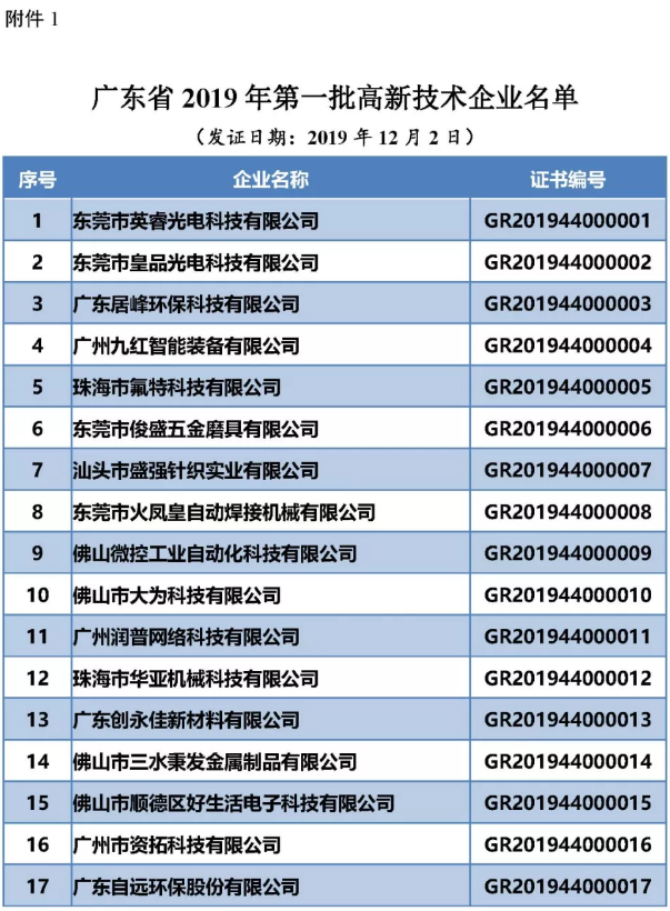 根据《科技部 财政部 国家税务总局关于修订印发〈高新技术企业认定管理办法〉的通知》(国科发火〔2016〕32号)和《科技部 财政部 国家税务总局关于修订印发〈高新技术企业认定管理工作指引〉的通知》(国科发火〔2016〕195号)的有关规定,经企业申报,广东省高新技术企业认定管理工作领导小组办公室组织认定,并报全国高新技术企业认定管理工作领导小组办公室备案批复同意,东莞市英睿光电科技有限公司等10525家企业被认定为广东省2019年高新技术企业(名单见附件1-3),享受高新技术企业所得税优惠政策期限为2019年1月1日~2021年12月31日,申领高新技术企业证书联系电话详见附件4。