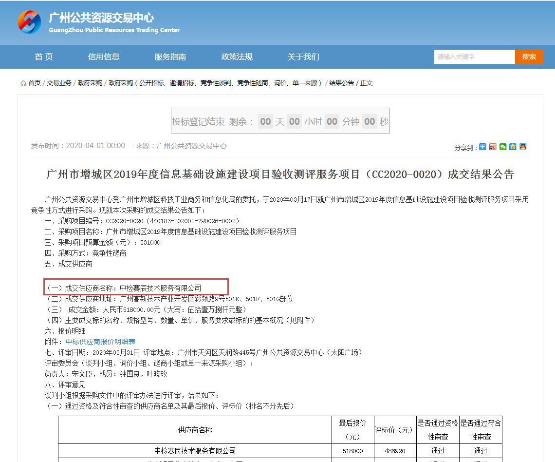 中检赛辰技术服务有限公司(以下简称:中检赛辰)于2020年4月1日成功中标【广州市增城区2019年度信息基础设施建设项目验收测评服务项目】,中标金额518000元。