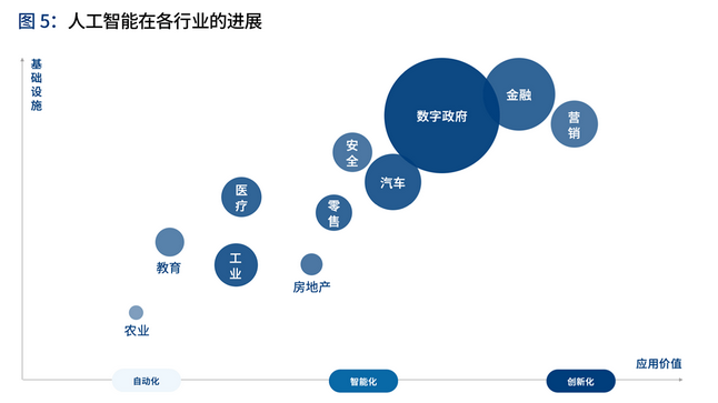 报告分析,随着产业数字化带来的数据基础的日益成熟,人工智能在营销、金融、数字政府、零售、医疗等行业的落地持续推进,并开始带来显著的效益,但落地进展有先后之分。在部分行业,传统企业已经充分认可人工智能的应用价值,开始在实际业务场景规模化地引入相关技术。首先,在人工智能实际落地过程中,产业的数字化基础设施是影响落地进展的关键要素。产业数字化程度越高,人工智能的应用具备越完善的数据基础。其次,在数据基础设施差异的基础上,人工智能技术与各行业具体业务场景结合产生的主流应用场景和价值呈现也有不同,会处于不同的应用价值阶段。最后,基于不同行业的市场规模体量,人工智能技术应用创造的市场规模大小不同。下图中,气泡的大小代表了现阶段各个行业人工智能应用的市场规模,包括软件、硬件和服务。