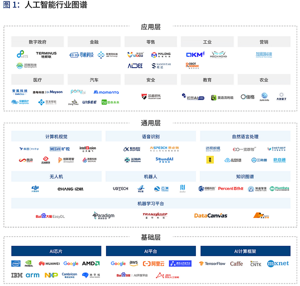 报告认为,从底层基础技术到上层行业应用,可以把人工智能行业划分为基础层、通用层和应用层三部分。基础层为图像、语音等人工智能基础技术提供芯片、计算框架等计算能力支持,通用层提供感知、认知计算等通用技术,而应用层则是人工智能通用技术与各行业深度融合产生应用价值的产品和服务。