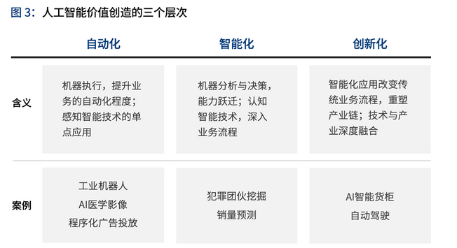 报告指出,发展至今,人工智能经历了明显的泡沫降温,进入了技术成熟度曲线的低谷期。行业开始回归理性,更多地关注人工智能如何落地产业,推动企业的数字化转型。人工智能落地产业带来的价值创造,可以分为自动化、智能化、创新化三个层次,每个层次创造的价值度逐步提升。