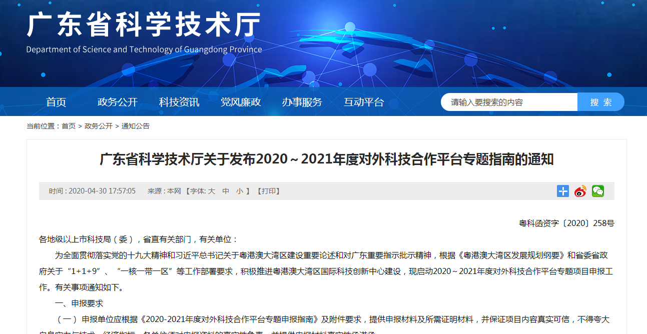 为全面贯彻落实党的十九大精神和习近平总书记关于粤港澳大湾区建设重要论述和对广东重要指示批示精神,根据《粤港澳大湾区发展规划纲要》和省委省政府关于“1+1+9”、“一核一带一区”等工作部署要求,积极推进粤港澳大湾区国际科技创新中心建设,现启动2020~2021年度对外科技合作平台专题项目申报工作。有关事项通知如下。